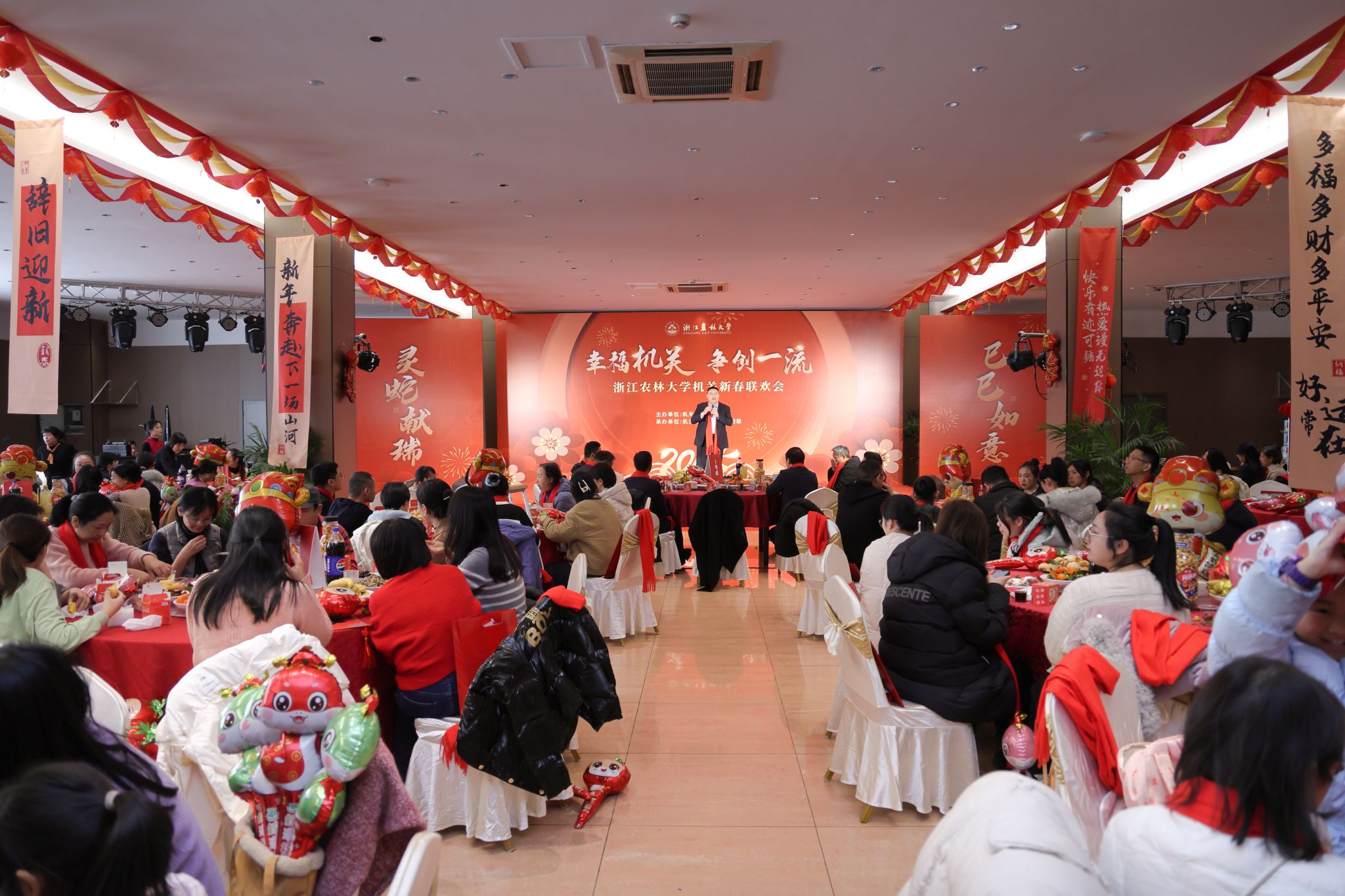 1月9日,食健學(xué)院在銀杏餐廳舉辦“食光新歲 健行筑夢(mèng)”2025新春聯(lián)歡活動(dòng)。聯(lián)歡會(huì)表彰了在科學(xué)研究、人才培養(yǎng)、黨建思政、社會(huì)服務(wù)等方面為學(xué)院做出重要貢獻(xiàn)的一批教師代表,鼓勵(lì)全體教職工新的一年再接再厲,再創(chuàng)佳績(jī)。聯(lián)歡活動(dòng)還設(shè)置了寫春聯(lián)福字、辭舊迎新、包餃子吃餃子比賽、現(xiàn)場(chǎng)小游戲、大合唱等環(huán)節(jié)。現(xiàn)場(chǎng)氣氛熱情洋溢、其樂融融,充分展現(xiàn)了教職工凝心聚力、積極向上的良好精神風(fēng)貌,活動(dòng)在一片歡樂祥和的氛圍中落下帷幕。