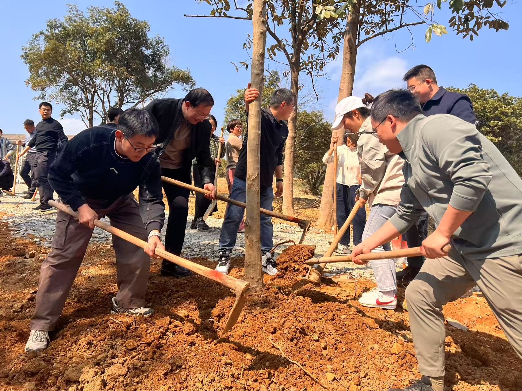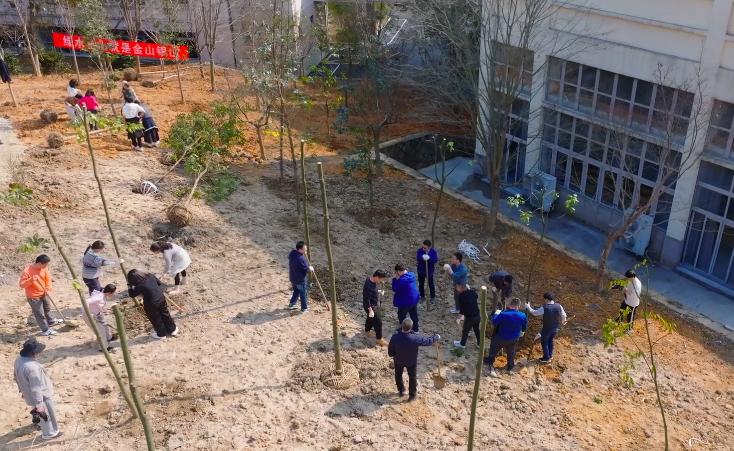 師生們手持鋤頭、鐵鍬等工具,鏟土、拍土、植入、扶苗、覆土定植……大家分工合作、密切配合,每個(gè)步驟都有條不紊,整個(gè)勞動(dòng)場面繁忙而有序。不到2小時(shí),柿樹、三角楓、紅豆樹、紅豆杉、細(xì)柄阿丁楓、浙江楠等近50株承載著希望的樹苗迎著春風(fēng)而立,煥發(fā)出勃勃生機(jī),為大地增添了新綠。