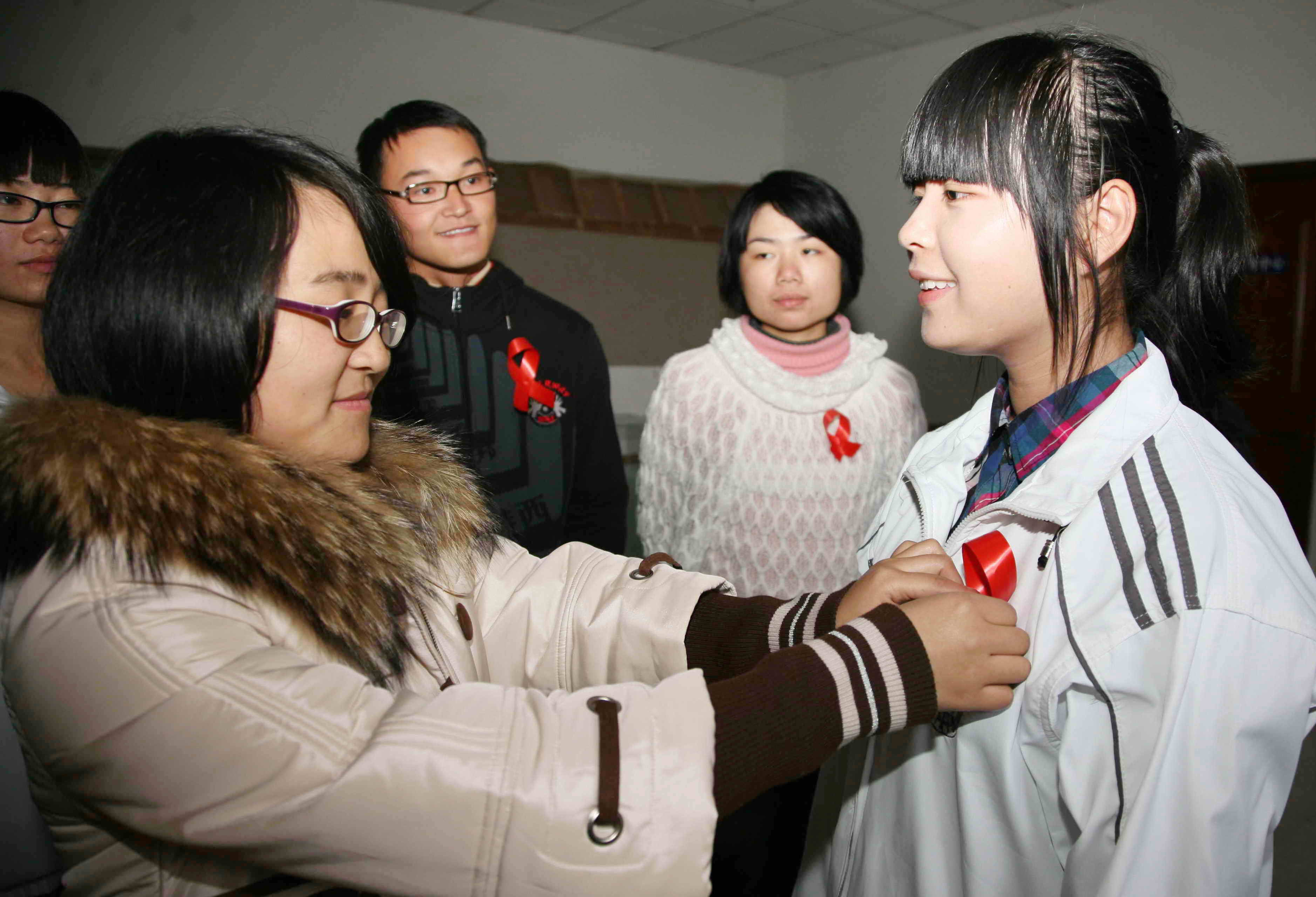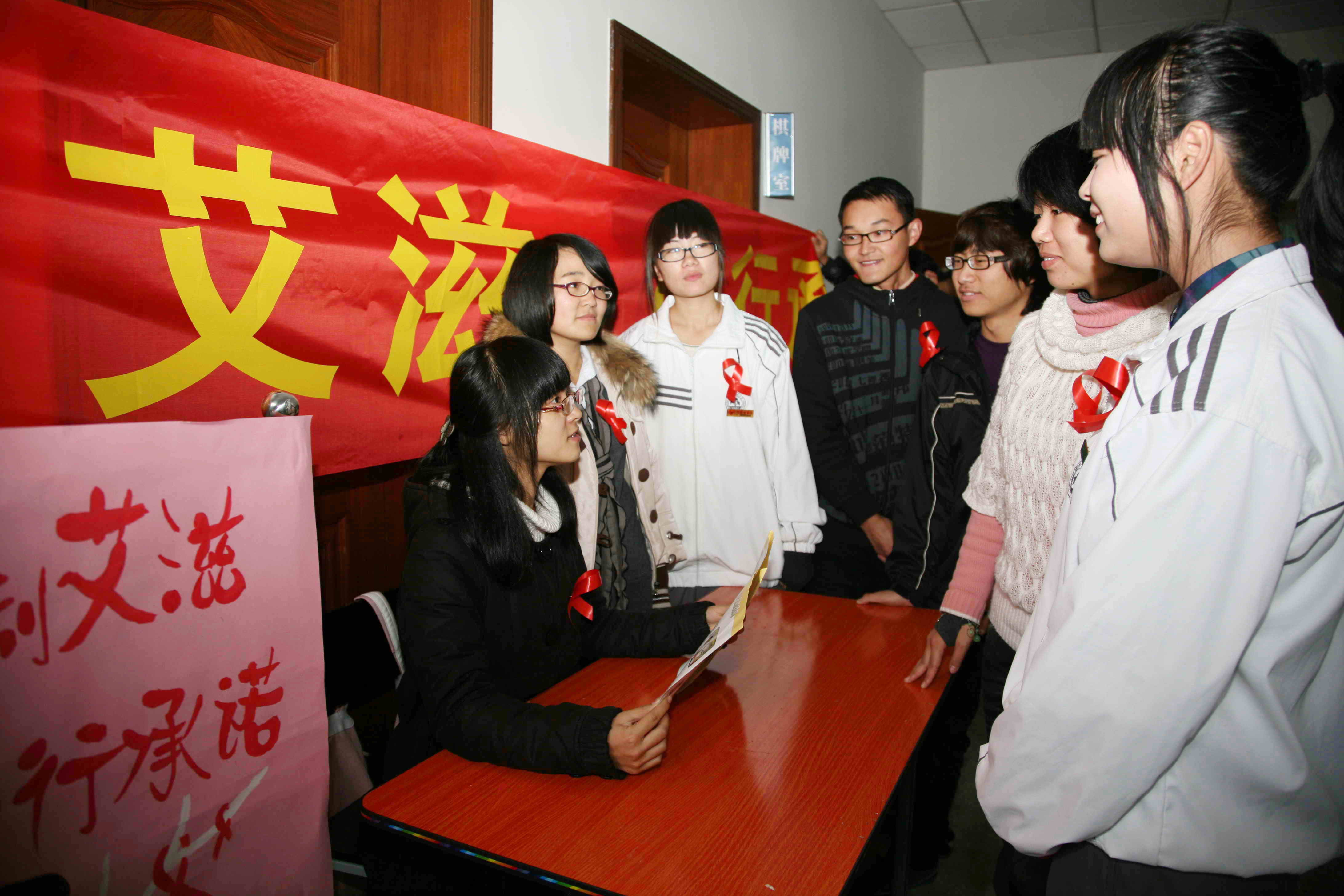 11月30日,我校志愿者在活動中心向廣大同學(xué)宣傳艾滋病預(yù)防知識,并為同學(xué)佩帶上紅絲帶,鼓勵(lì)他們加入到以艾滋病預(yù)防志愿者的行列,組織各種形式的活動宣傳艾滋病知識,迎接世界艾滋病日的到來。