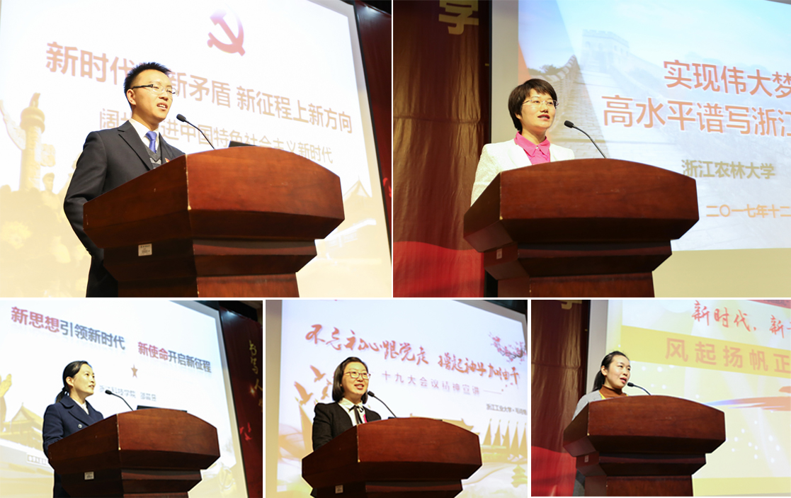 巡講團成員浙江大學陳澤星、浙江科技學院邵晨昱、浙江工業大學毛詩焙、浙江農林大學宋春春、浙江外國語學院周禮分別圍繞“新時代里新矛盾 新征程上新方向”“新思想引領新時代 新使命開啟新征程”“不忘初心跟黨走 擼起袖子加油干”“實現偉大夢想 高水平譜寫浙江新篇章”“新時代,新青年,風起揚帆正當時”作主題宣講。他們從學生的實際生活出發,用大學生感興趣的方式、喜聞樂見的語言,接地氣地宣講黨的十九大精神,讓師生們對黨的十九大精神有了更深刻的理解,更近距離感受到“中國夢”也是每個人的美好生活夢。
