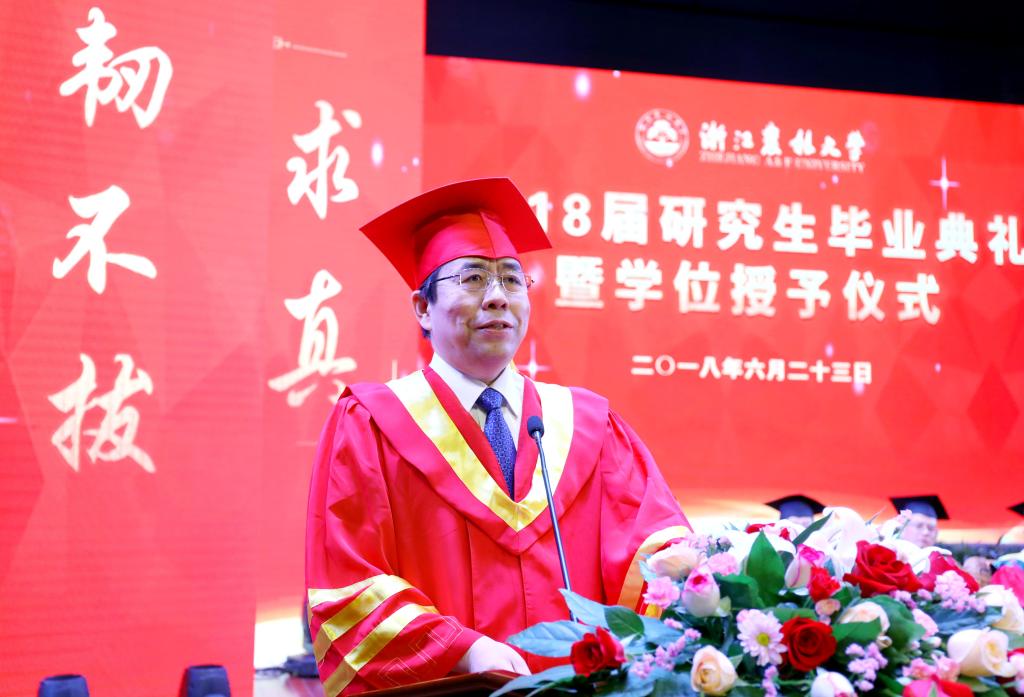 今天,是2018屆584名博士研究生和碩士研究生的畢業之期,而后意味著你們即將踏入社會,繼續放飛夢想。作為你們的校長和老師,此時此刻,我的心中有一個關于時間的矛盾:我很想時間能夠快些走,好讓優秀的你們盡快在時代的熔爐里千錘百煉、淬火成鋼,早日成為國家、民族、社會之棟梁。同時我也希望時間能夠慢點走,因為師生間的情感與不舍,讓我和所有老師們不愿如此善良、如此努力、如此優秀的你們離開農林大學這個溫暖的“大家庭”。但是,在這你們完成學業并走向未來的重要時刻,我首先還是要向順利完成學業并全面成長的各位同學表示熱烈的祝賀!另外,在座的同學們非常幸運,因為你們在校期間親自見證了學校在加強內涵建設和提升辦學實力上先后取得的一系列重大突破,如:成功獲批博士學位授予單位,同時獲得五個一級學科博士學位授權點;順利入選浙江省重點建設高校;植物學與動物科學、工程學2個學科領域同時進入ESI全球1%;獲批浙江省屬高校首個國家重點實驗室等等。在此,我特別想說的是,這些突破性成就的取得與在座各位同學的辛勤努力是分不開的。因此,我代表學校向你們表示衷心的感謝!