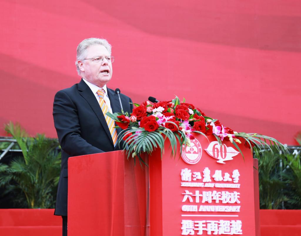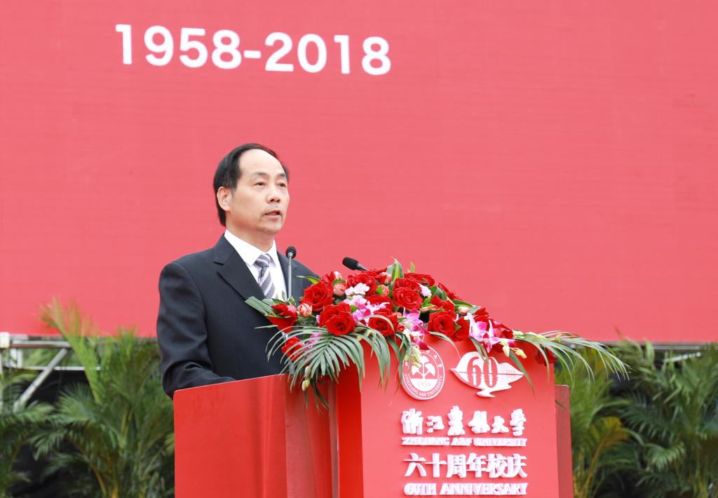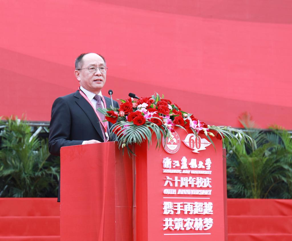 彭佳學代表浙江省人民政府向學校60華誕表示祝賀。他指出,學校始終與國家共命運,與時代齊奮進,辦學水平不斷提高,綜合實力顯著增強,培養了一大批高素質人才,取得了一大批高水平科研成果,為我省“三農”事業、生態文明建設和經濟社會發展作出了重要貢獻。省政府將一如既往地支持學校的發展,為學校改革發展創造更好條件、提供更優服務。他希望學校服務鄉村振興,對標國家“雙一流”大學,聚焦高水平內涵建設,深化教育教學改革,厚植學科專業優勢,構建高水平的人才培養體系,提升科研創新和社會服務能力,早日建成更有活力、更高水平、更富特色的高水平大學,為實施鄉村振興戰略,推進浙江“兩個高水平”建設作出新的更大貢獻。