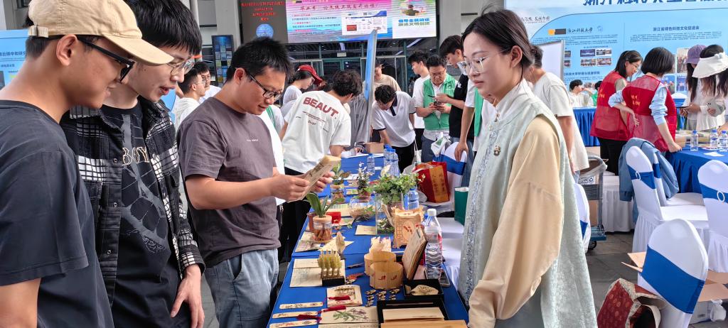 新綠地土壤協(xié)會展示了社團成員手工制作的精美生態(tài)缸以及多種空氣凈化能力較強的植物樣本和室內(nèi)植物盆栽;竹木文創(chuàng)設(shè)計與制作協(xié)會展示了通過刨切微薄竹技術(shù)制作的錄取通知書、竹書《大學(xué)》、竹制書簽、小熊貓徽章等30多樣展品。