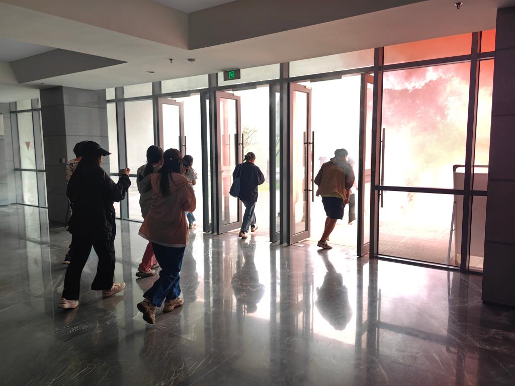 演練假設實驗室因電氣線路問題引發火災,險情發生后,通知單位消防責任人,同時向校園消防部門報警。接警后,學院立即啟動消防應急預案,組織國家重點實驗室人員進行疏散。