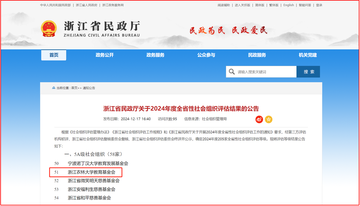 12月17日,浙江省民政廳公布2024年度全省性社會組織評估結果。經自主申報、資格審核、材料上報,第三方評估機構線上初評、現場評估,浙江省社會組織評估復核委員會復核,浙江省社會組織評估委員會終評并公示,浙江農林大學教育基金會獲評“5A級社會組織”。據悉,本次參評的205家社會組織中,僅58家獲評“5A”等級,其中高校基金會僅8家。