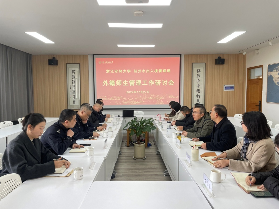 12月27日,杭州市公安局出入境管理局副局長金曉明一行來校調研指導我校外籍師生管理工作,杭州市公安局臨安區分局副局長羅雪峰,臨安區出入境管理科相關同志陪同調研。我校國際處、保衛處相關負責人,國際教育學院(孔子學院)班子成員、相關管理人員參加會議。
