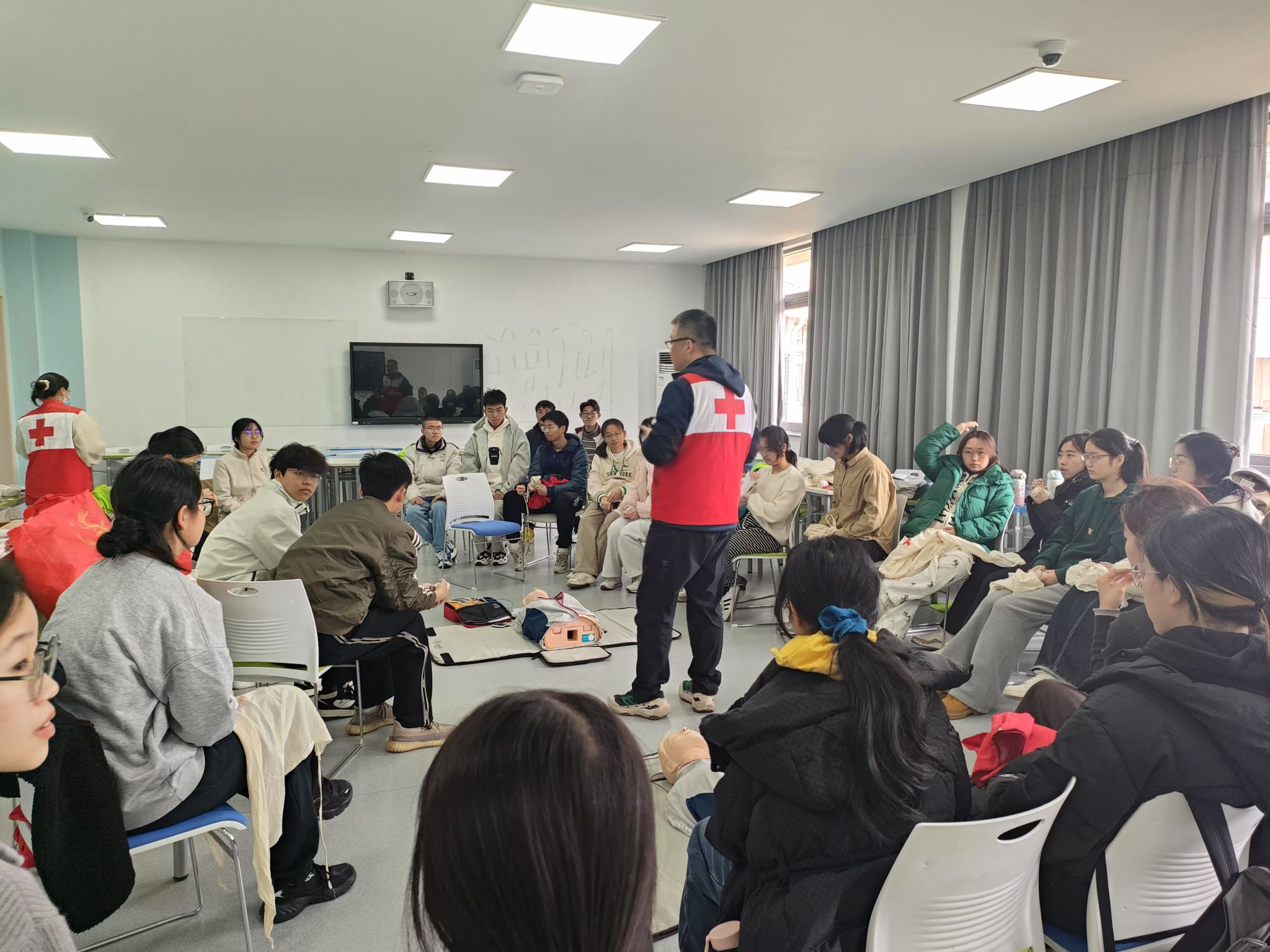 培訓內容涵蓋理論講解與實踐操作兩部分。理論培訓環節,專業講師詳細介紹了心肺復蘇具體的按壓頻率、按壓深度、人工呼吸的時間以及各方面注意事項;細致講解了各類受傷出血情況用到的環形、螺旋、八字等包扎方法;詳細講述了不同骨折部位如何固定。志愿者們全神貫注,認真汲取知識。