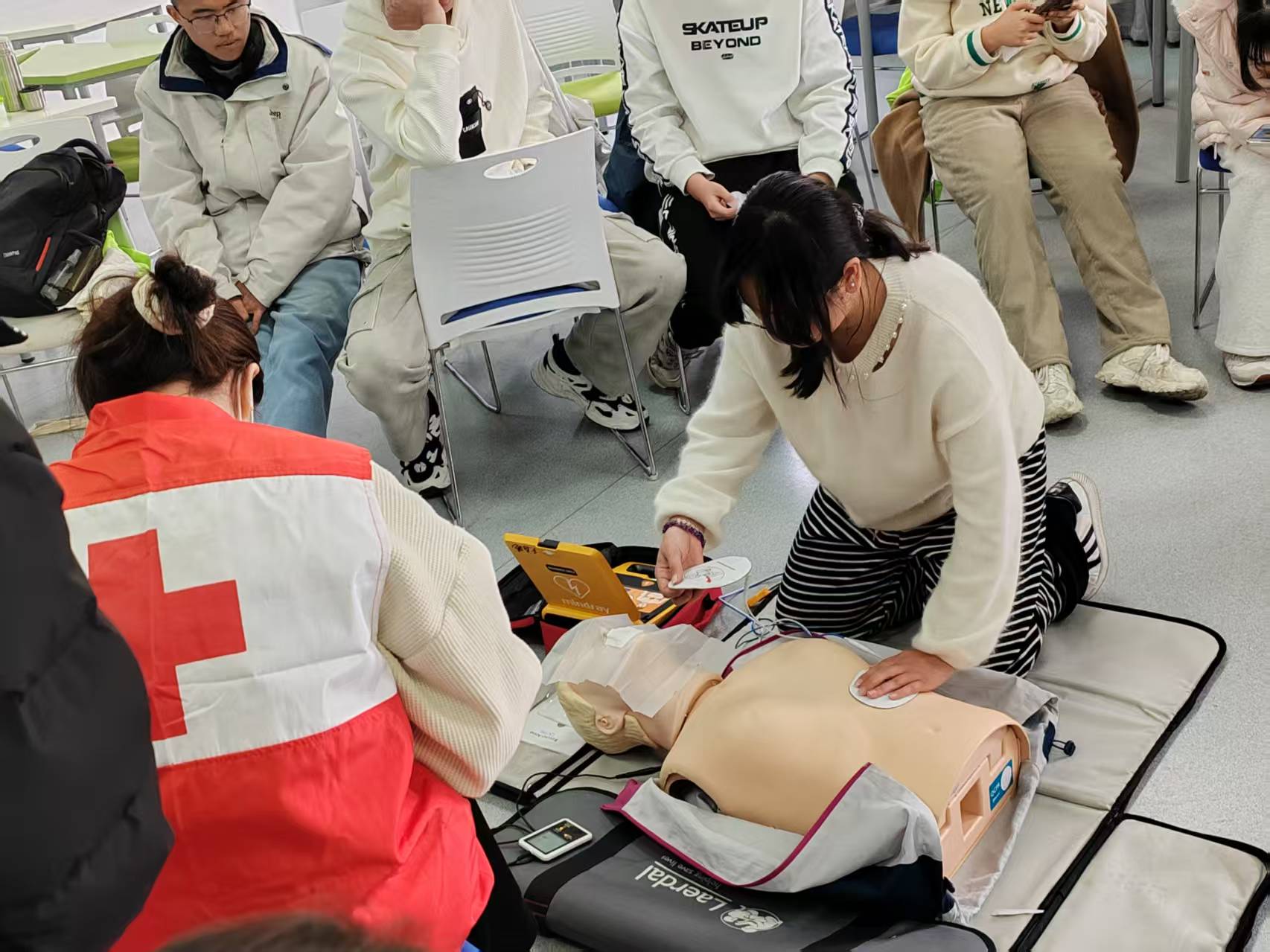 在考核環節,志愿者們首先進行了包扎止血和使用三角巾固定骨折手臂的考試。隨后,志愿者們挑戰了難度更高的心肺復蘇(CPR)與自動體外除顫儀(AED)使用考核,嚴格按照模擬操作流程進行。盡管胸外按壓極為消耗體力,但沒有一位志愿者選擇放棄。最終,所有同學順利通過考核,獲得了紅十字救護員證書。參與培訓的志愿者紛紛表示,此次培訓不僅讓他們掌握了實用的急救技能,更增強了社會責任感和助人意識。