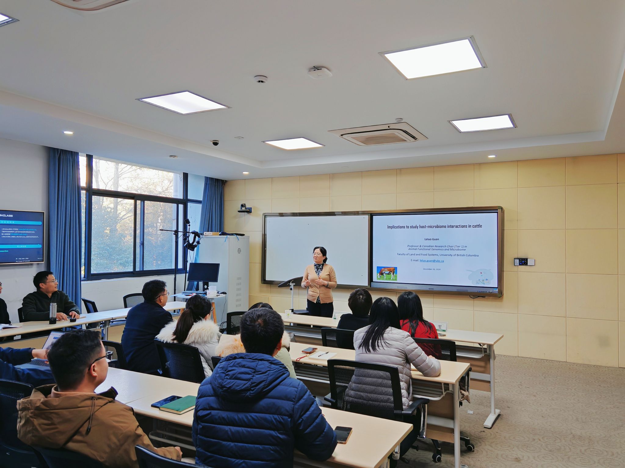 12月16日下午,加拿大不列顛哥倫比亞大學Leluo Guan教授應邀來動科動醫學院進行學術交流活動,校黨委委員、動科動醫學院院長宋厚輝,學院黨委書記魏玲玲參加交流會。Leluo Guan作題為“Implications to study host-microbiome interactions in livestock animals”的學術報告。畜牧學科師生參加會議。