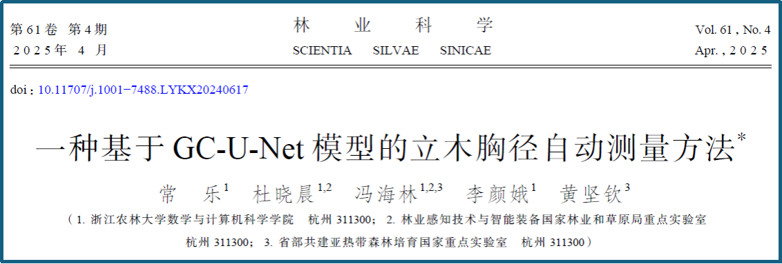 近日,數計學院馮海林教授團隊的學術論文“一種基于GC-U-Net模型的立木胸徑自動測量方法”一文在《林業科學》2025年第4期以封面論文發表。《林業科學》是林草科技領軍期刊,入選中國科技期刊卓越行動計劃,也是目前唯一被EI收錄的中文林業科技期刊。該論文第一作者為數計學院22級農業信息化研究生常樂,通訊作者為馮海林教授。浙江農林大學數學與計算機科學學院為該論文第一單位和通訊作者單位。