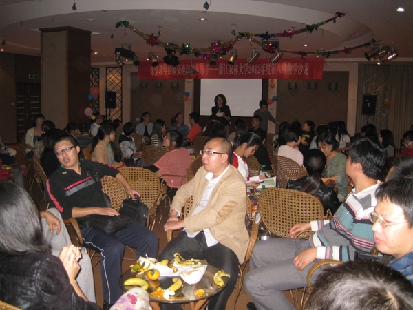 浙農林大新聞網訊 10月12日晚,校2012年度第八期教學沙龍在東湖校區活動中心工會演藝吧舉行。本次活動主題為“課堂教學的經驗交流與改革思考”,由教師教學能力培訓中心主辦,“精彩一課”示范觀摩課主講教師及園林學院孫海濤副教授應邀參與,青年教師研修班老師與新教師共60余人參與了活動。