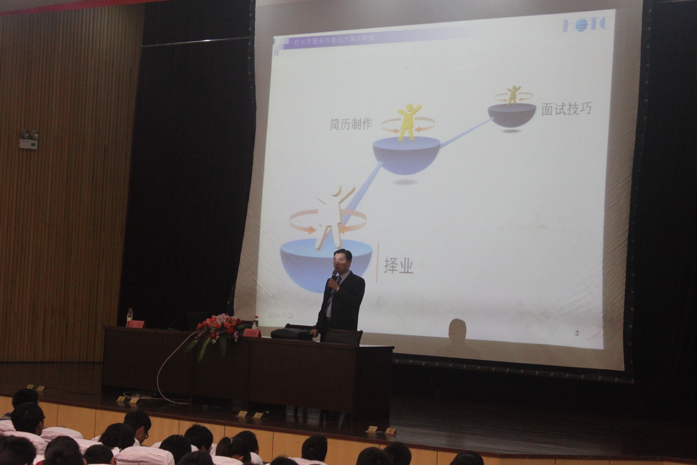 此次講座邀請到了杭州市服務外包人才培訓聯盟秘書長、杭州潤秀軟件有限公司總經理宣舒鈞主講。宣總曾擔任過多家知名企業的HR總監,有著豐富的面試經驗。他首先分析了當前的就業形勢,鼓勵同學們面對嚴峻形勢要“有的放矢”。接下來,他從用人單位的角度,向同學們介紹了求職過程中擇業準備、簡歷制作、面試過程的技巧、就業心態等方面知識,并且和同學們分享了寶貴的成功求職經驗。