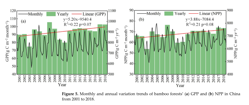 竹林是我國亞熱帶地區重要且特殊的森林資源,由于其分布范圍廣、生長速度快、固碳能力強等特點,在調節全球碳平衡等方面發揮著重要的作用。本研究以中國竹林為研究對象,以中國竹林遙感分布信息、竹林LAI同化數據產品和土壤、氣象等數據等驅動BEPS模型,模擬2001-2018年近20年中國竹林GPP和NPP,并分析了GPP、NPP時空演變格局及其對氣候因子的響應。