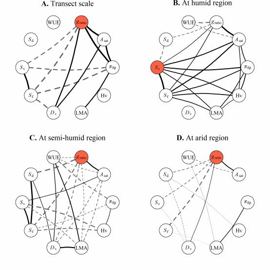 (3)網絡分析進一步揭示了克服這些閾值的機制,即氣孔打開比例在不同的空間尺度上均是網絡中心性最高的性狀(Fig. 4),從而介導了協作網絡沿環境梯度的適應性變化。介導作用具體表現為:在濕潤地區,葉片雖然發育了最大解剖學導度(gsmax),但為病原體防御需要,其打開比例(gratio)是最低的;在半濕潤/半干旱區,氣孔的打開比例保持在最佳位置(gratio≈ 20%,保衛細胞在這一位置其運動最佳,打開和關閉動作最迅速,因而可以迅速調節二氧化碳進入和水分喪失),從而獲得了最高的水分利用效率;在干旱區,因為葉片冷卻和氣體交換的需要,葉片擁有最低的gsmax,但最大的gratio(這一發現也解釋了干旱區物種的機會主義行為:即干旱區植物利用濕潤周期,使其光合作用遠大于濕潤區物種的現象)。