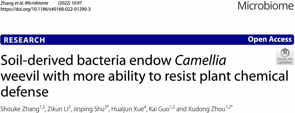 近日,國家重點(diǎn)實(shí)驗(yàn)室森林健康“森林-昆蟲-微生物互作”研究團(tuán)隊(duì)(周旭東教授課題組)在微生物學(xué)領(lǐng)域頂級期刊《Microbiome》(中科院1區(qū)TOP期刊,IF=16.837)上發(fā)表研究論文《Soil-derived bacteria endowCamelliaweevil with more ability to resist plant chemical defense》,揭示了來源于土壤的腸道細(xì)菌賦予茶籽象更強(qiáng)的植物化學(xué)抗性抵抗能力。