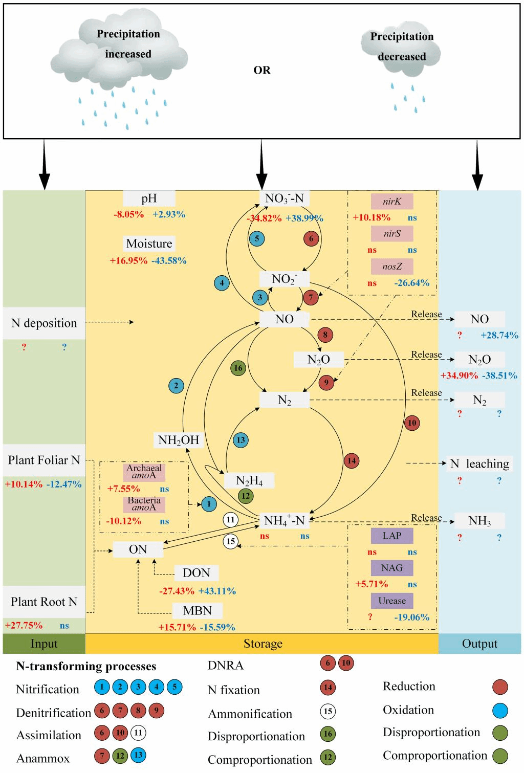 全球氣候變化導致的降水改變將對生態系統土壤氮循環施加強烈影響。然而,降水改變是否會對全球范圍內干旱區和濕潤區的土壤氮循環過程產生不同影響尚不清楚。因此,李彥教授團隊整合分析了1036對觀測結果,量化了全球范圍內降水增加和減少對干旱區和濕潤區土壤氮輸入(植物氮返還)、固存(土壤中各形態氮)和輸出(氣態氮排放)的影響,填補了上述空白。研究結果表明:(1)降水增加顯著提升了土壤氮輸入和輸出,卻降低了土壤氮固存;而降水減少產生的影響與之完全相反;(2)干旱區土壤氮循環對降水增加更為敏感,而濕潤區土壤氮循環則對降水減少更為敏感;(3)降水改變對土壤氮循環的影響與降水類型(降雨與降雪)無關;(4)局部地區的年平均降水量是調節土壤氮循環對降水改變做出具體響應行為的關鍵。這意味著,土壤氮循環對降水增加和減少的響應行為在干旱區和濕潤地區之間存在具體差異,全球氣候變化將對這兩種氣候區內土壤氮循環產生不均衡的影響作用。因此,在未來構建相關模型進行預測研究時,為提升相關研究的精確性,應著重考慮干旱區和濕潤區之間差異。