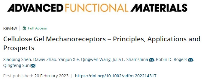2023年2月20日,林業(yè)工程學(xué)科生物質(zhì)仿生智能研究團(tuán)隊(duì)青年教師教師沈曉萍以第一作者在材料科學(xué)領(lǐng)域國際期刊《Advanced Functional Materials》(中科院1區(qū)Top,IF=19.924)在線發(fā)表題為“Cellulose gel mechanoreceptors - principles, applications and prospects”(木質(zhì)纖維素凝膠基智能機(jī)械感受材料-原理、應(yīng)用及展望)的綜述論文。通訊作者為美國得克薩斯理工大學(xué)Julia L. Shamshina助理教授、美國阿拉巴馬大學(xué)Robin D. Rogers教授和浙江農(nóng)林大學(xué)孫慶豐教授。浙江農(nóng)林大學(xué)化學(xué)與材料工程學(xué)院為該論文第一單位和通訊作者單位。
