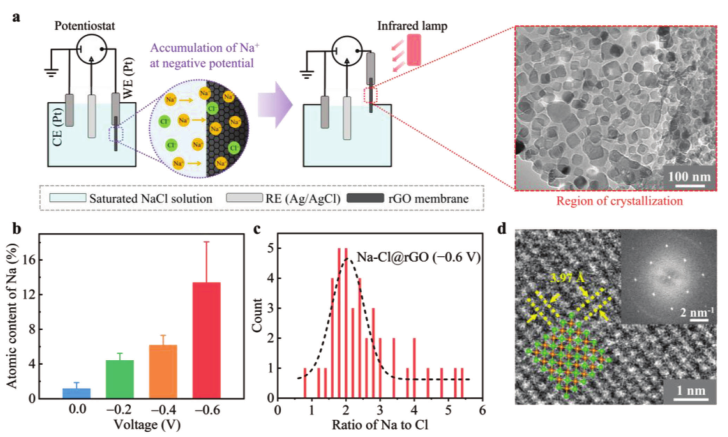 該團隊設計了一種可將rGOM中Na2Cl含量提升一個數量級的方法,將rGOM附著在三電極配置的電化學工作站的工作電極上,通過在rGOM上施加負電勢,加強結晶過程中Na+-π相互作用。在-0.6V的電勢下,Na2Cl晶體增加了10倍以上。常規的rGOM不具備壓電特性,而含有Na2Cl晶體的rGOM則表現出優異的壓電性能。當該rGOM彎曲150°時,可獲取180mV的輸出電壓,為這種含有異常鹽晶體的二維材料在場效應晶體管、新型多鐵性材料等實際應用的實現提高了有力支撐。