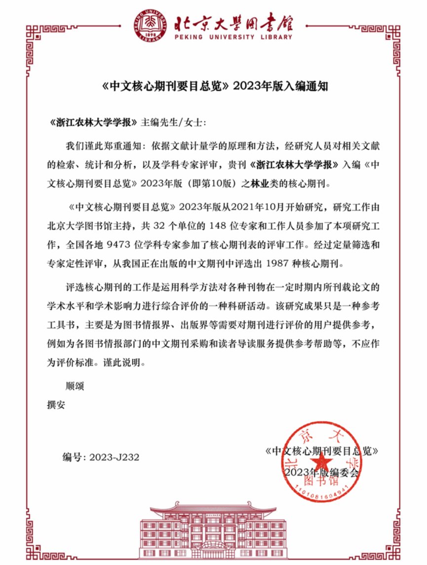 近日,《浙江農林大學學報》入編《中文核心期刊要目總覽》2023年版(即第10版)之林業類的核心期刊。這是本刊連續第十次被《中文核心期刊要目總覽》列為全國中文核心期刊。