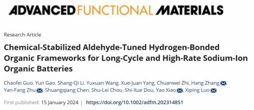 化材學院化學學科新能源材料與傳感器件團隊再次在國際知名期刊《Advanced Functional Materials》(中科院1區Top,IF=19)在線發表題為“Chemical-Stabilized Aldehyde-Tuned Hydrogen-Bonded Organic Frameworks for Long-Cycle and High-Rate Sodium-Ion Organic Batteries”(用于長周期高倍率鈉離子有機電池的化學穩定的醛調諧氫鍵有機框架)的研究論文。本校青年教師郭超飛為第一作者,化學學科羅錫平教授為通訊作者,澳大利亞工程院院士竇士學,侴術雷教授,肖遙教授為主要合作作者。浙江農林大學為第一單位,合作單位為上海交通大學,溫州大學,上海理工大學和香港城市大學。