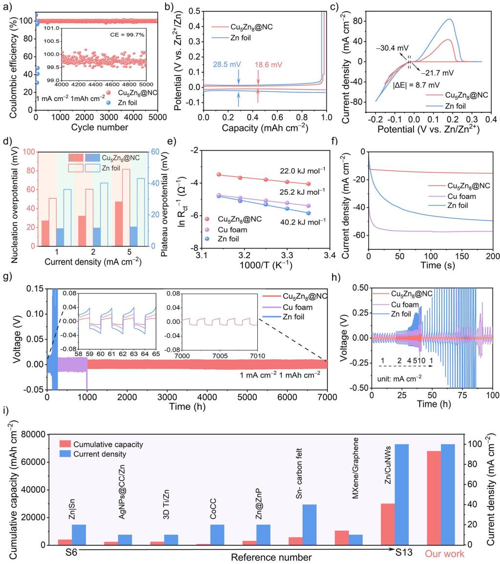基于此,胡勇教授課題組報道了在泡沫銅上開發核殼納米棒陣列穩定鋅負極。該納米棒陣列由氮摻雜碳包覆Cu5Zn8合金組成(Cu5Zn8@NC)。內層Cu5Zn8合金具有較小的成核能壘,可作為優先成核位點。分層陣列作為保護層,可容納高容量的鍍鋅,通過“先捕獲后填平”機制引導鋅沉積。所得的保護層在均勻界面離子通量和降低局部電流密度方面起著重要的作用。優化后的Cu5Zn8@NC負極在5000次鍍鋅/剝離循環中庫侖效率高達99.7%。對稱電池在1 mA cm–2和1 mAh cm–2下具有7000小時的超長循環壽命,過電位僅為16.5 mV。組裝的鋅離子全電池在10000次充放電循環后,容量保持率高達89.2%。
