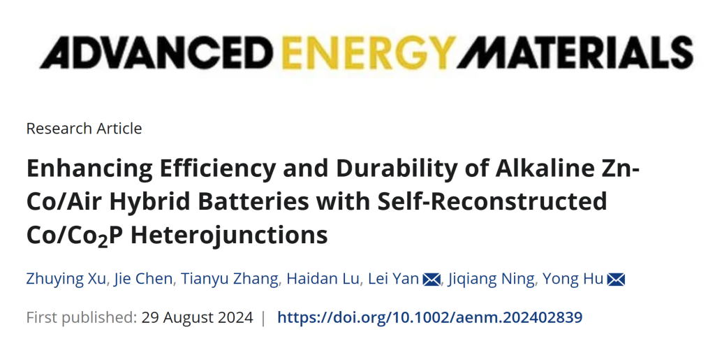近日,化材學院胡勇教授、顏磊講師在國際頂尖期刊《Advanced Energy Materials》(中科院1區Top,IF=24.4)在線發表題為《自重構Co/Co2P異質結構提高堿性Zn-Co/air雜化電池的效率和耐久性》(Enhancing Efficiency and Durability of Alkaline Zn-Co/Air Hybrid Batteries with Self-Reconstructed Co/Co2P Heterojunctions)的研究論文。該工作成功合成了一種類似小麥狀的Co/Co2P@PNCF材料,并首次將其作為可充電Zn-Co/air雜化電池的高效自支撐陰極,實現了雜化電池優異的性能輸出。論文通訊作者為化材學院胡勇教授,共同通訊作者化材學院顏磊講師。