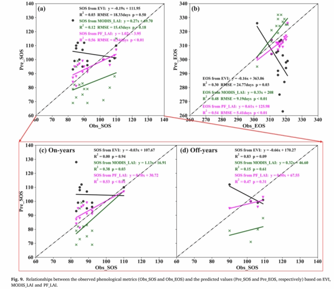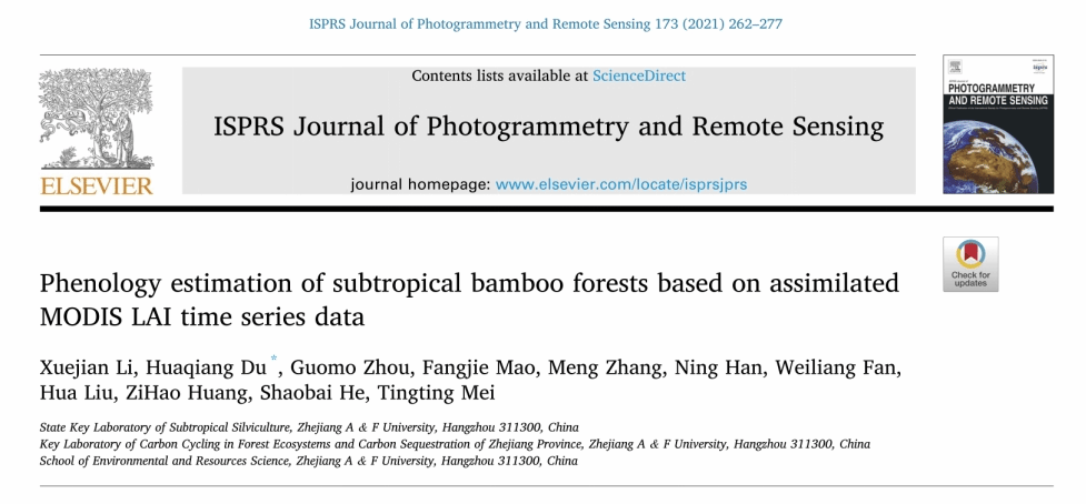近日,國家重點實驗室森林碳匯研究團隊遙感領域國際頂級期刊《ISPRS Journal of Photogrammetry and Remote Sensing》(IF=8.979)發表題為“Phenology estimation of subtropical bamboo forests based on assimilated MODIS LAI time series data”的研究論文。該研究創新構建基于LAI同化的竹林SOS(生長季開始)和EOS(生長季結束)遙感反演模型,解決了傳統植被指數EVI無法反演亞熱帶竹林物候的難題,初步探明了竹林物候的時空演變趨勢,為深入研究竹林碳匯功及形成機制能提供了極為重要的關鍵參數。