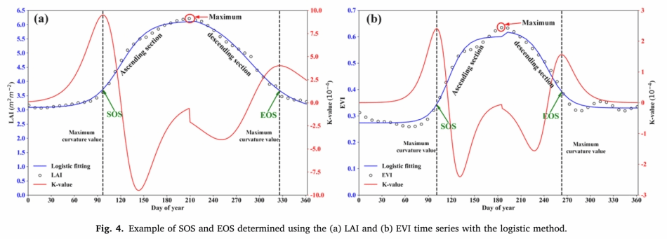 本研究創新構建基于LAI同化的竹林物候遙感反演模型系統,實現了竹林物候(SOS、EOS)時空分布高精度反演。該模型系統首先構建LAI同化系統,獲得高精度MODIS LAI時間序列同化產品;然后,利用每年LAI最大值將竹林生長過程分為生長階段和下降階段;最后,采用logistic回歸方程對兩個階段分別進行擬合并計算擬合方程的曲率,以兩個階段最大曲率對應的日數作為SOS和EOS。