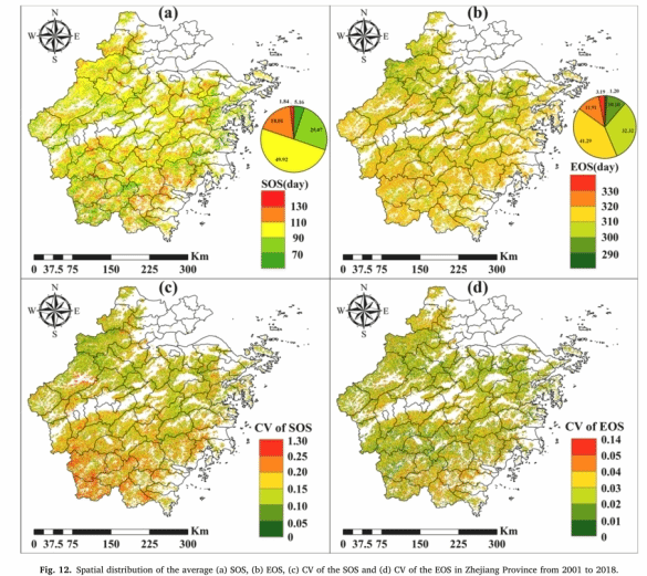 根據所構建的竹林物候遙感反演模型,反演得到近20年浙江省竹林物候時空分布格局。分析表明,浙江省竹林物候具有明顯的空間變異特征,SOS具有從西北到東南呈先提前到再延遲的趨勢,而EOS具有從西北到東南呈延遲和延長的趨勢;從時間上看,近20年浙江省70%左右的竹林SOS具有顯著提前趨勢,平均每年提前0.83天,60%左右的竹林EOS呈延遲趨勢,平均每年延遲0.28天,70%左右的竹林LOS呈延長趨勢,平均每年延長1.12天。