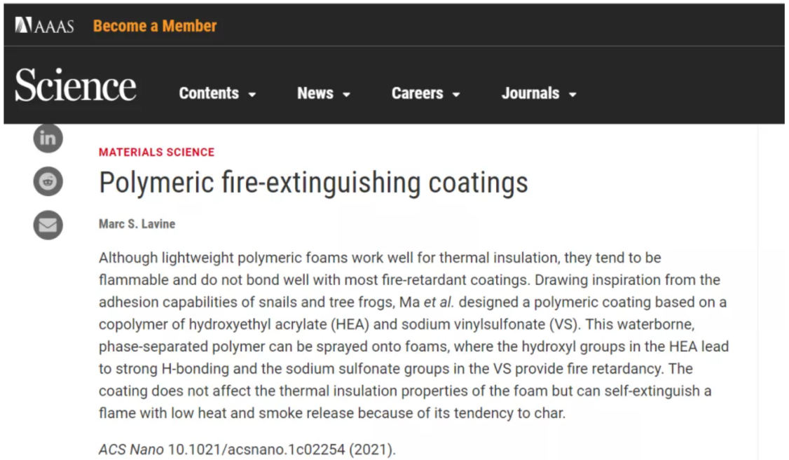 馬哲文和徐瀟東作為共同第一作者撰寫的論文“Bioinspired, Highly Adhesive, Nanostructured Polymeric Coatings for Superhydrophobic Fire-Extinguishing Thermal Insulation Foam”于2021年6月25日發表在化學與材料領域高水平國際期刊《ACS Nano》(IF=15.881)上,指導老師為澳大利亞南昆士蘭大學宋平安教授。該研究論文被國際頂級學術期刊《Science》以“Polymeric fire-extinguishing coatings”為題在Editors’ Choice中進行推薦報道。