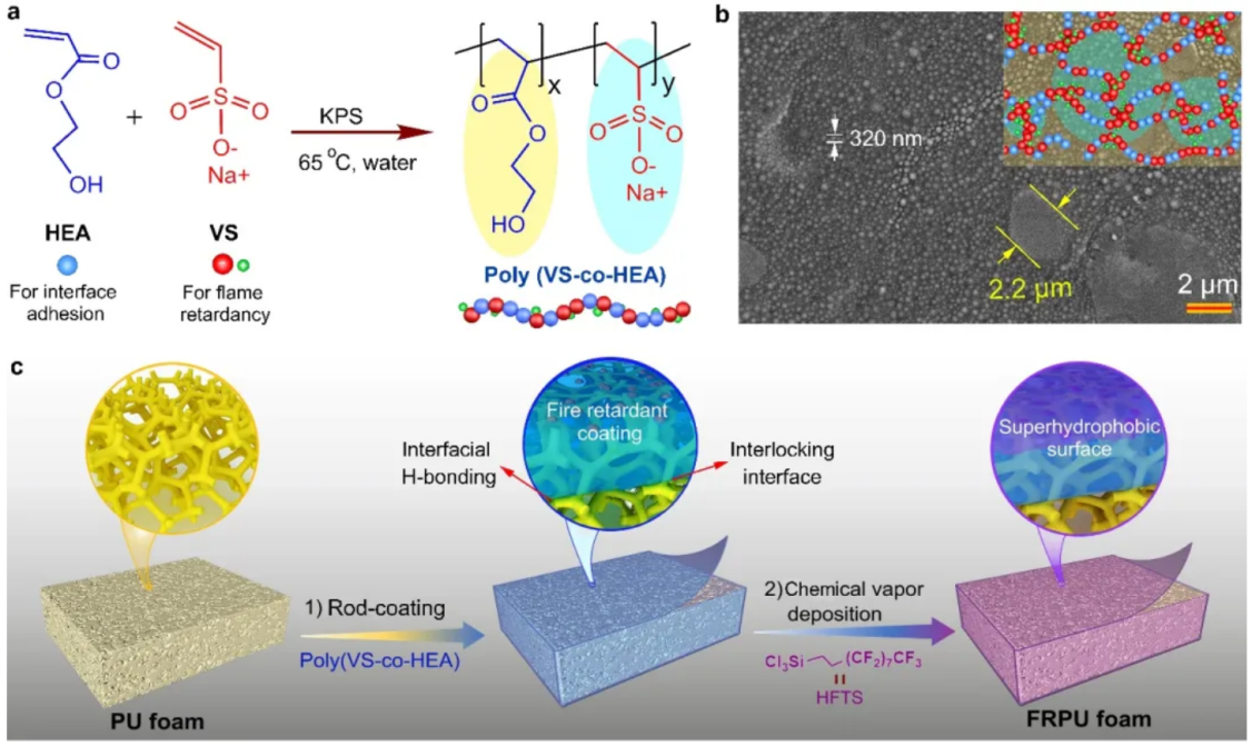 該成果受自然界中蝸牛與樹蛙粘附機制的啟發,以丙烯酸羥乙酯(HEA)和乙烯基磺酸鈉(VS)為原料,通過自由基共聚,合成了一種水性poly(VS-co-HEA)共聚物。共聚物中豐富的羥基通過界面氫鍵使其具有很強的界面附著力。同時VS中的磺酸鈉基團提供了阻燃性,并誘導產生了能與聚氨酯(PU)表面產生機械互鎖的相分離微/納米結構。另外,通過對涂層的進一步疏水處理,可使其實現超疏水特征,降低其水敏感性。此外。除了高剪切粘結強度(>2.2 Mpa)外,經該共聚物處理的硬質聚氨酯泡沫塑料還表現出了高達35.5%的極限氧指數(LOI),達到了理想的UL-94 V-0等級,并且最大熱釋放速率(PHRR)(降低87%)和總煙霧釋放量(TSR)(降低71%)顯著降低,明顯優于以往的阻燃PU泡沫塑料。