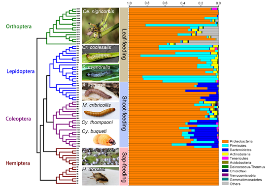 腸道微生物在宿主發育和食性生態位適應中發揮了重要作用。本研究針對專性取食竹子的昆蟲,從腸道菌群多樣性探討昆蟲食性的趨同適應性進化。食竹昆蟲腸道菌群優勢類群為變形桿菌,后壁菌門和擬桿菌門,腸道菌群結構在取食固體(竹葉和竹筍)與液體食物(竹汁液)的兩類昆蟲間截然不同。取食固體的昆蟲雖然為遠源譜系,但其腸道菌群結構表現出顯著交叉,可見腸道菌群促進了昆蟲對竹類高纖維素食物的適應性進化。盡管昆蟲的系統發育和食性共同主導了腸道菌群結構,但昆蟲系統發育驅動了纖維素降解菌為代表的功能菌群結構變異。本研究證實,食性生態位一致的近源物種在長期進化過程中共享了極其相似的腸道菌群,為未來研究昆蟲取食策略如何影響宿主和腸道微生物互作奠定了基礎,也能為開發靶向殺蟲劑提供依據。