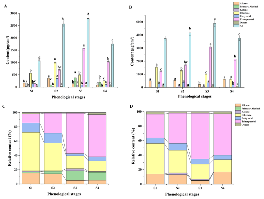 圖2不同發育階段藍莓表皮蠟質含量