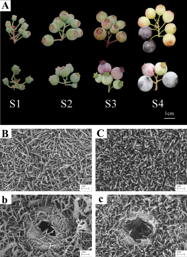 本研究以十年生兔眼藍莓‘巴爾德溫’、‘燦爛’為材料,在轉色期進行褪黑素處理,采用氣相色譜-質譜聯用技術(GC-MS)測定兔眼藍莓表皮蠟質的組分和含量,探究褪黑素對藍莓果實發育期蠟質和果實品質的影響。研究結果發現兩個品種均存在不同期成熟現象。通過掃描電鏡觀察發現藍莓果皮蠟質呈白色桿狀,氣孔被蠟質填充,兩個品種無明顯差異(圖1)。