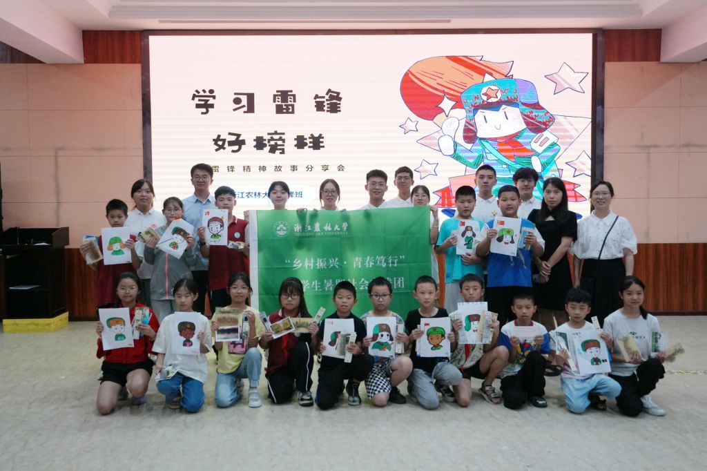 儀式結束后,雷鋒班“鄉村振興·青春篤行”社會實踐團的同學們開展了暑期支教、調研訪談等形式多樣的實踐活動。雷鋒故事會上,實踐團隊向幸福小學的學生講述了雷鋒的故事,分享了“時代楷模”黃文秀的事跡,教會他們合唱《學習雷鋒好榜樣》,繪制雷鋒畫像,鼓勵他們在浙江農林大學明信片上寫下自己的夢想并作交流分享。