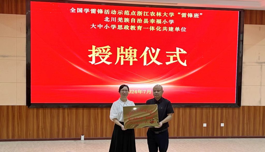 7月21日,浙江農林大學雷鋒班實踐基地、雷鋒班與北川羌族自治縣幸福小學大中小學思想政治教育一體化共建單位的授牌儀式在幸福小學報告廳舉行。幸福小學黨總支書記唐榮生、校長張斌等領導,文法學院農村發展碩士點負責人、雷鋒班黨支部書記及相關師生代表參加活動。