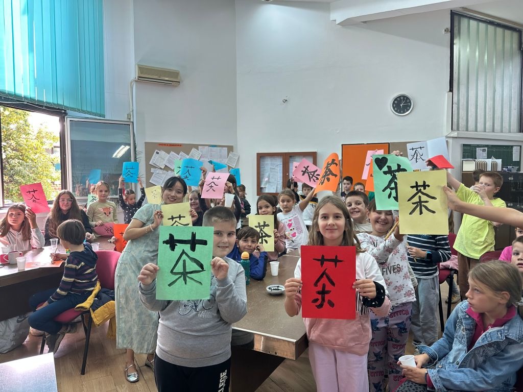 體驗課上,孩子們認真學習了中文的聲調和問候語,一起學唱了中文歌曲。課堂在品茶和書法體驗環節達到高潮,在老師的幫助下,他們嘗試著用毛筆一筆一劃認真地寫下 “茶” 字。本次活動還準備了國風特色的小禮品,現場氣氛十分熱烈。